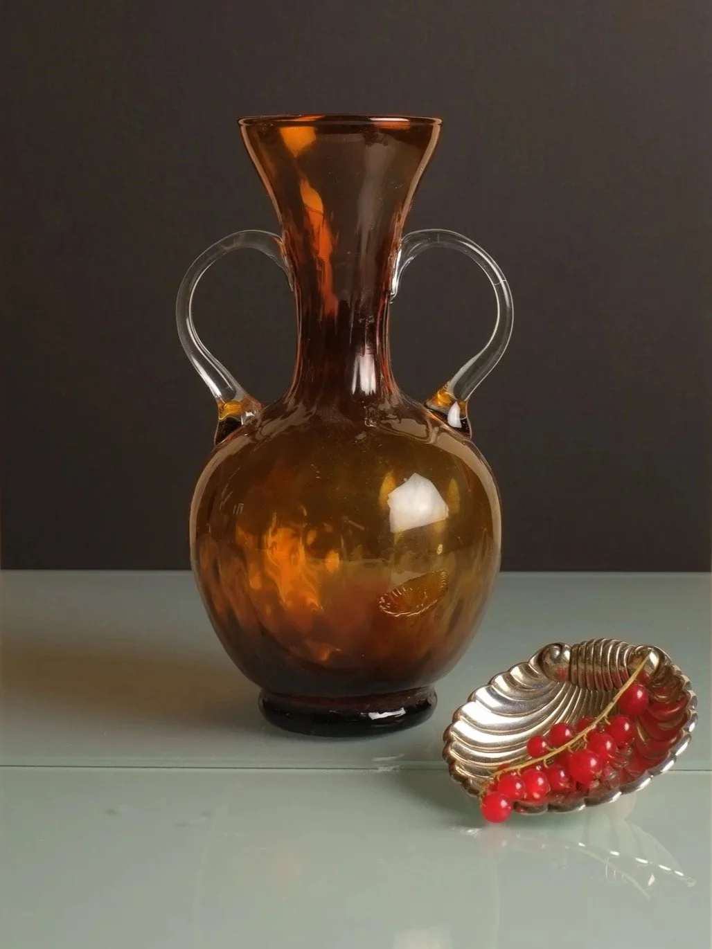 Image 1 of 1 Amber Glass Vase With Handles €75.00 Dimensions (cm): w11 x d10 x h21 Add To Cart Added! Dimensions (cm): w11 x d10 x h21