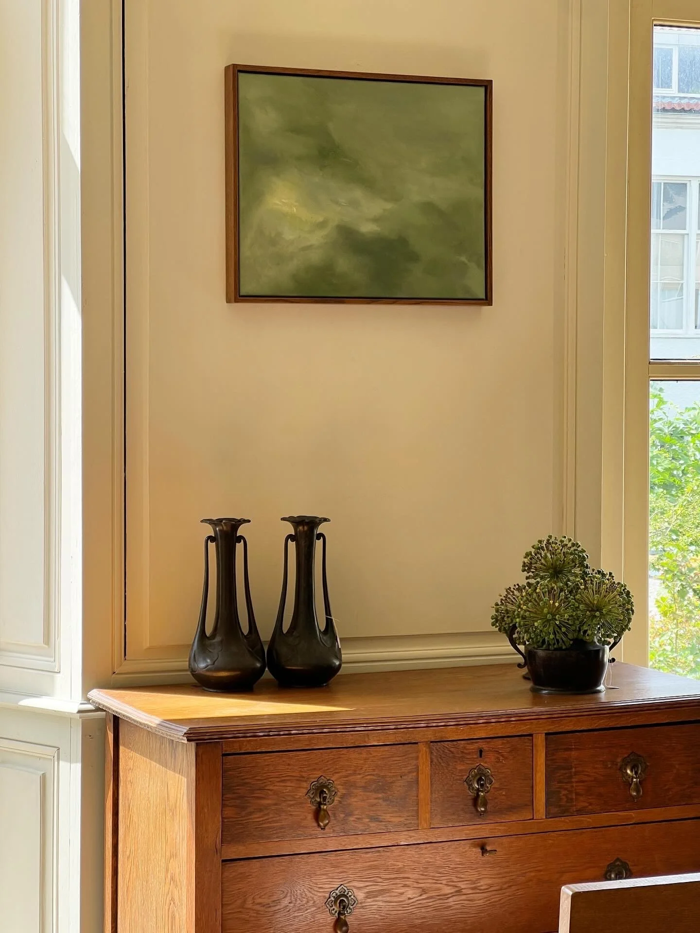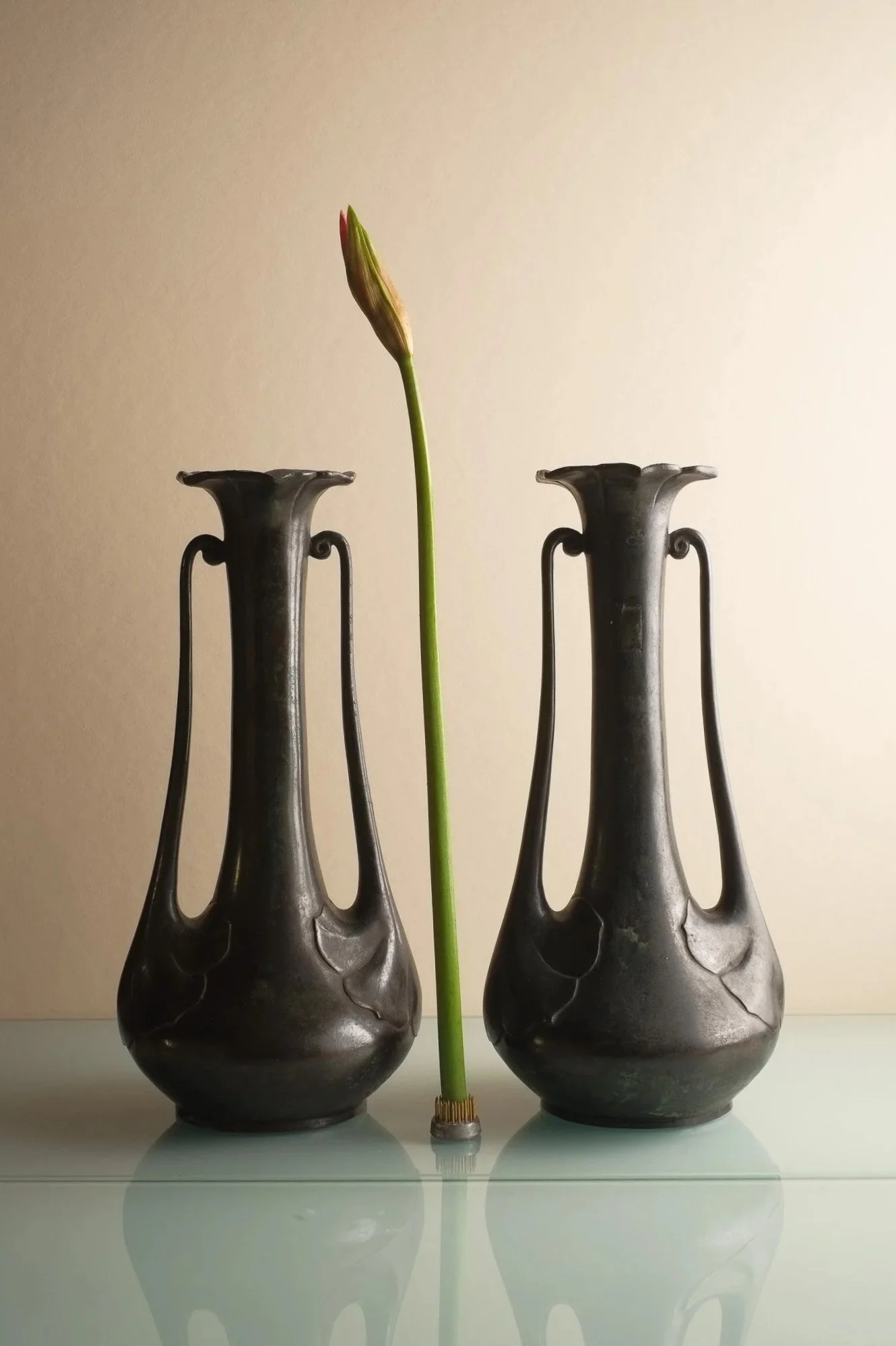 Elegant pair of elongated vases in dark patinated metal, featuring flowing handles and softly flared rims.